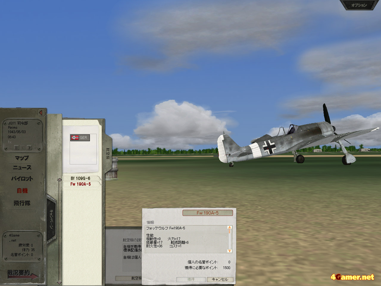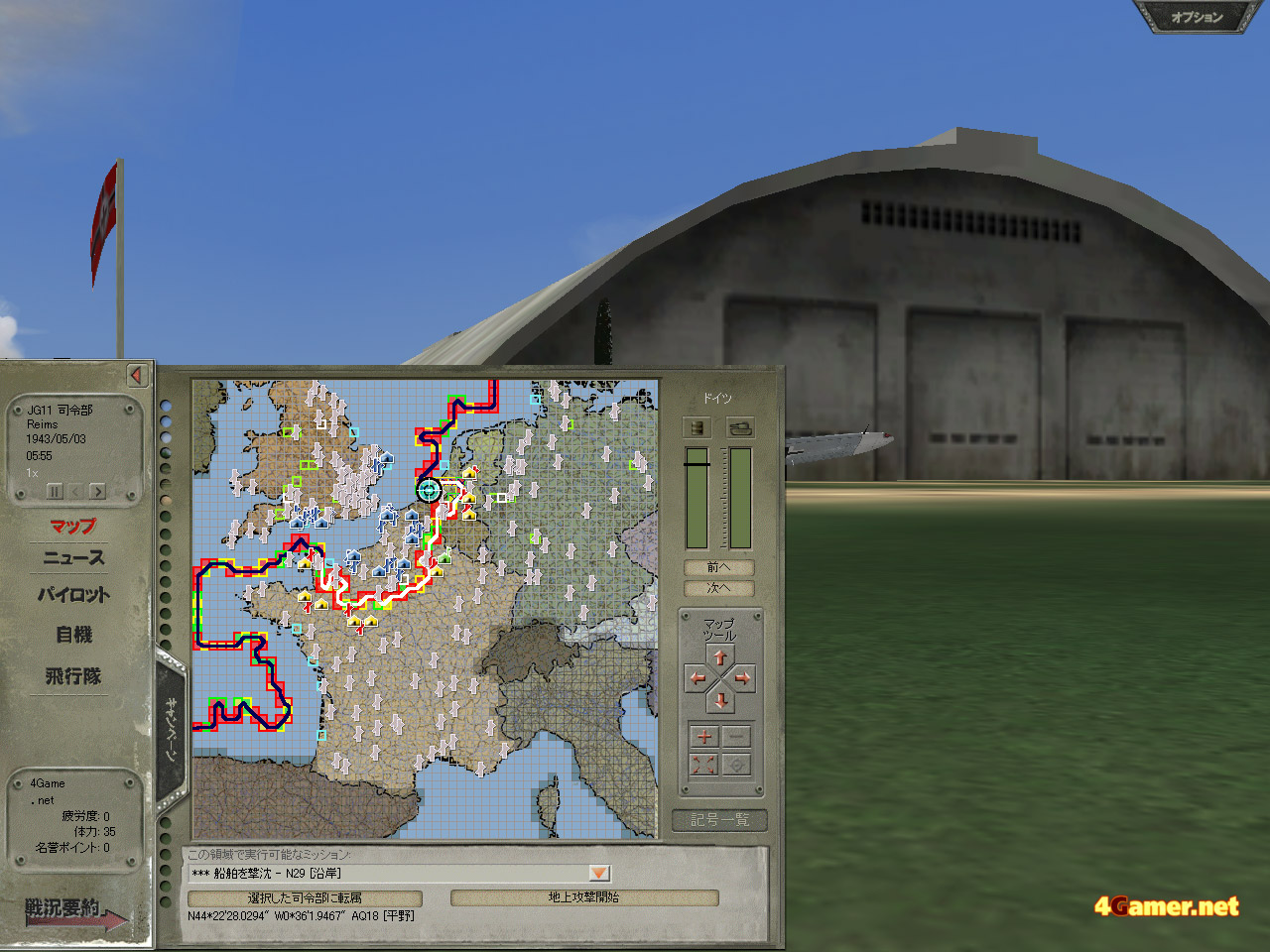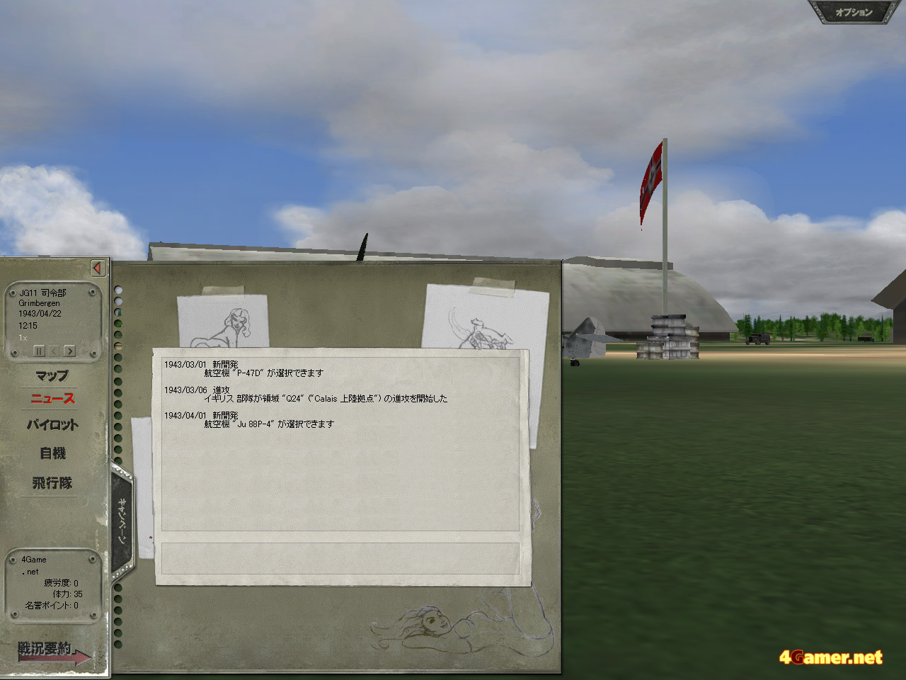 | 名誉ポイントがあれば最新鋭機に乗ることも可能 | ニュースを見る機能。時間の流れと共に史実に基づくイベントも発生する | 刻々と情勢が変化する。タイミングを見計らって出撃したい |