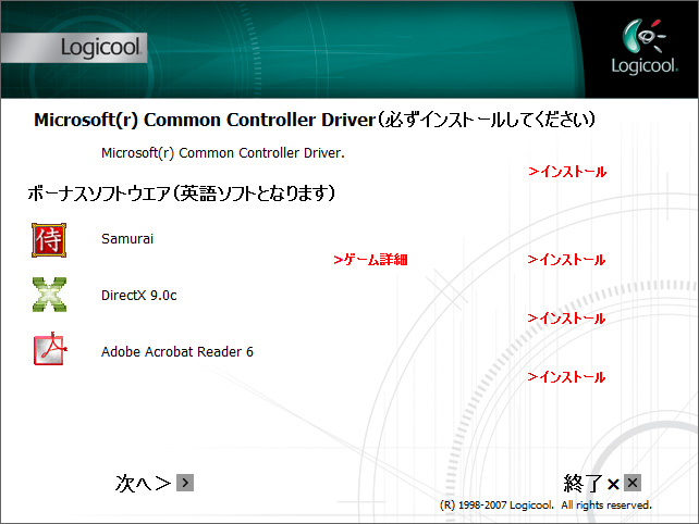| 付属CD-ROMのメニューウインドウ。「必ずインストールしてください」とあるが,DirectX Runtimeを適切に導入していれば必要ない |