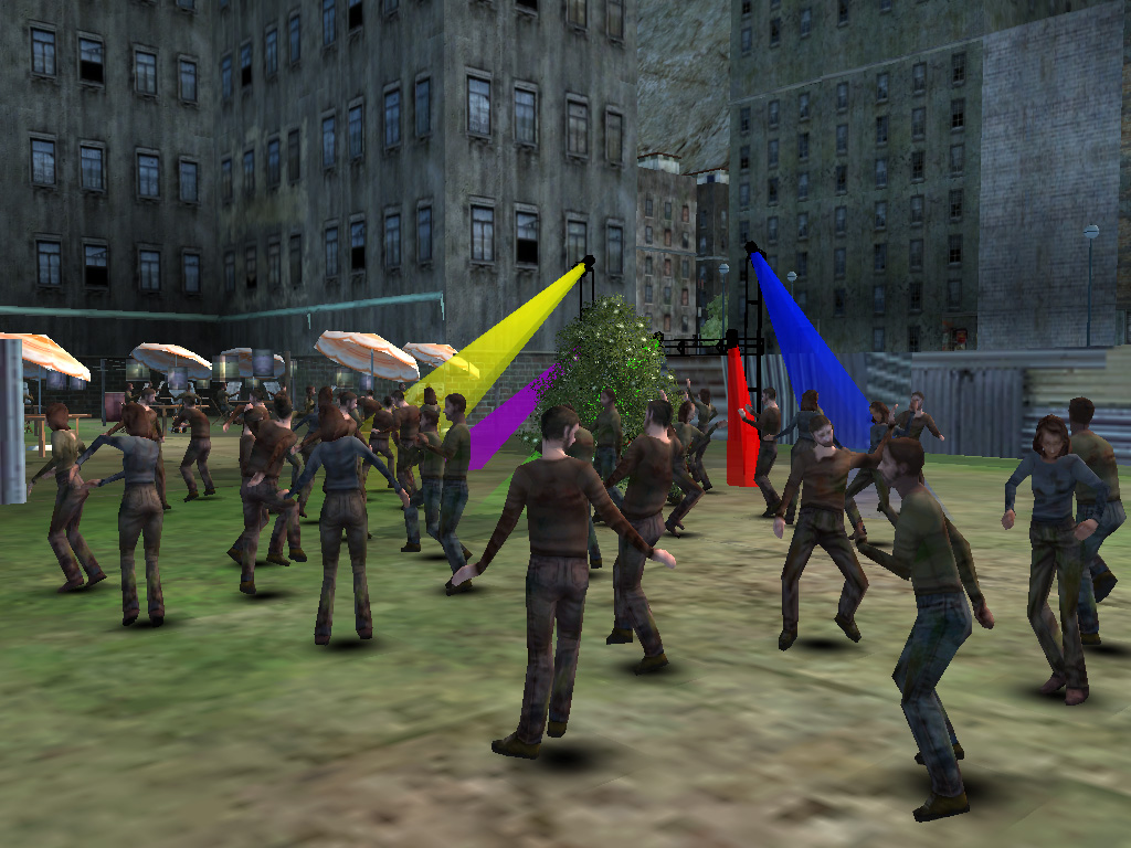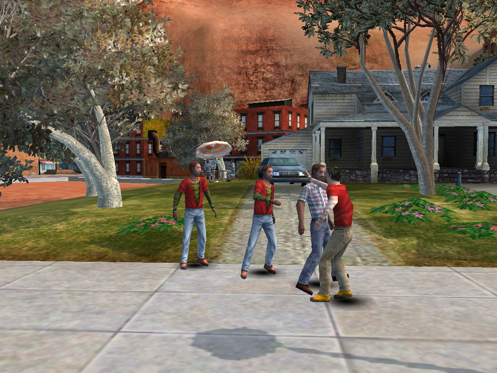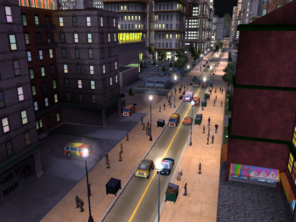 本作では,自分の街の中にいる住民の視点までカメラをズームさせて,一人称視点で街を眺められる。ズームさせた視点では住民の一人一人が描写されていて,歩道を歩いていたり,車に乗っていたり,公園でくつろいでいたりする。ときには喧嘩していたり,デモを行っている住民に出会うこともある。余暇施設で遊んでいる住民もいる。そんな中を,矢印キーやマウスを使って自由に動き回れるのだ。シムシティは最新作の4でも,まだこれは実現できていないので,この点はシティーライフの大きなポイントといえるだろう。