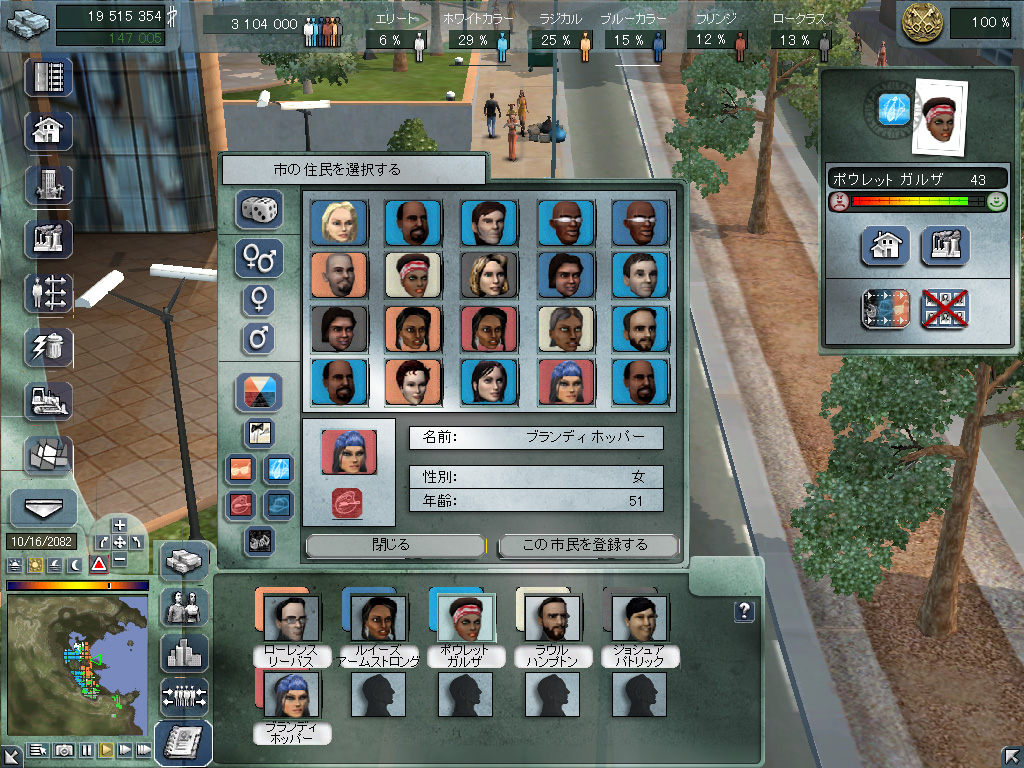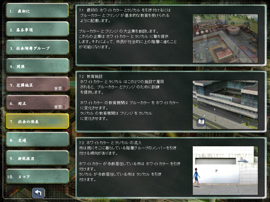 本作では「ロークラス」「フリンジ」「ブルーカラー」「ラジカル」「ホワイトカラー」「エリート」という6種類の住民が存在している。これらの住民の性格は,おおよそ次のようになっている。