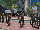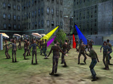 一人称視点で眺めていると面白いのだが,対立の第一段階では互いの住民の悪口を言い合ったり,対立する住民が通りかかると因縁をつけたりしている。それが激化してくると殴り合いの喧嘩や,抗議デモが始まる。最悪の状態は焼き討ちで,建物に火がついて火災になる。このあたりはさすが階級問題の存在する国,フランスのデベロッパの作品であると感じる部分だ。