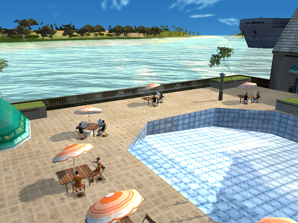 | 思いがけず救急車で運ばれる住民を目撃。喧嘩で負傷したのか,それとも病気にかかったのだろうか | 集団でダンスを楽しむ,ロークラスの住民達。六つの階級には,それぞれ異なった余暇の方法が用意されている | 観光スポットにリゾートホテルを建てれば大きな収入が期待できる。ちなみに右奥の船は,クルーズ船ではなく空母 |