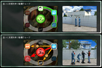 これら6階級は,下の画像のように円状の友好関係を持っていて,隣り合っているクラスの住民は仲良くできるが,対角にある住民同士は仲が悪く対立している。対立する住民同士は,職場は近くてもいいのだが,住居が近いとトラブルを起こす原因になる。