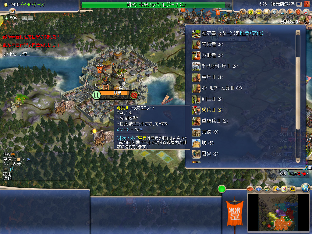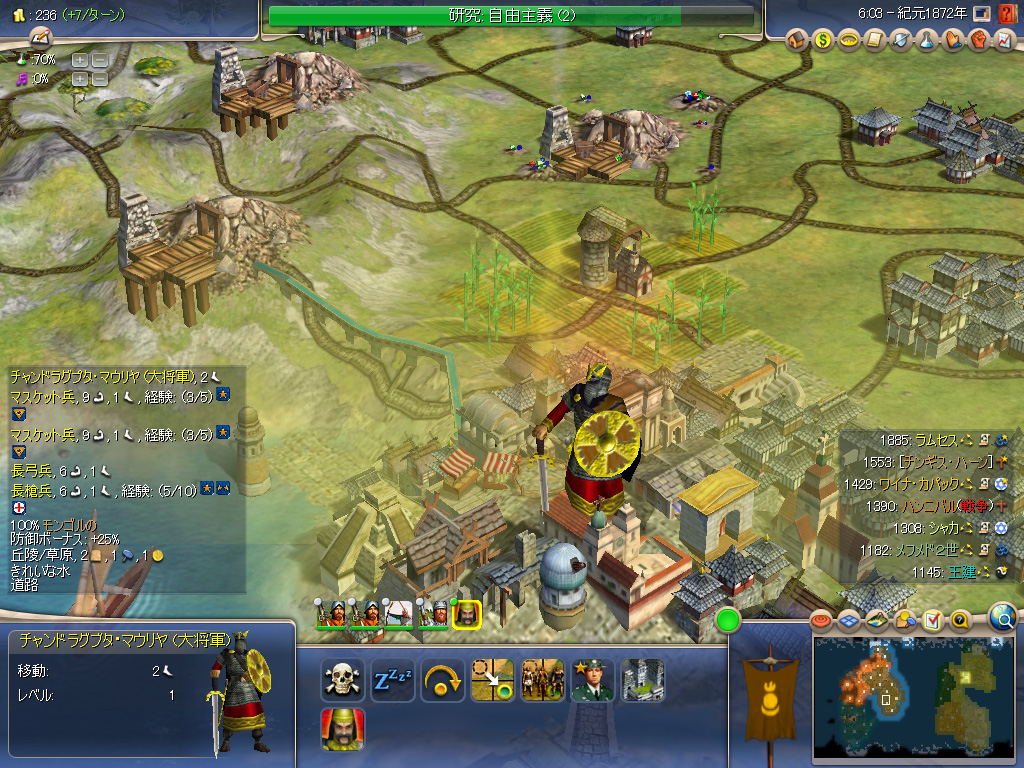 チンギス・ハーンは「帝国主義+攻撃」といかにもアグレッシヴな割り当てだったり,我が日本はと思って見れば徳川家康が「攻撃+防衛」と,暴れやすそうな(逆に,敵として出てくると厄介そうな)文明もかなりある。大将軍システムと併せて考えると,戦争を積極的に志向したプレイをしやすい文明/指導者が,オリジナルのCiv4よりもはっきり打ち出された印象が強い。