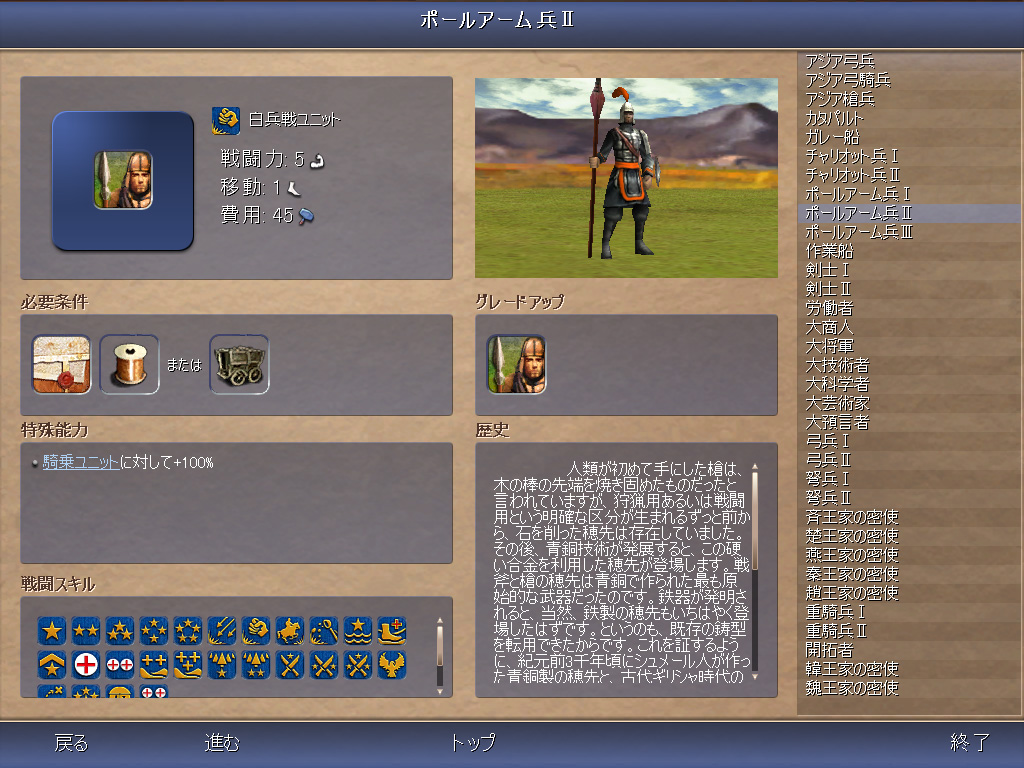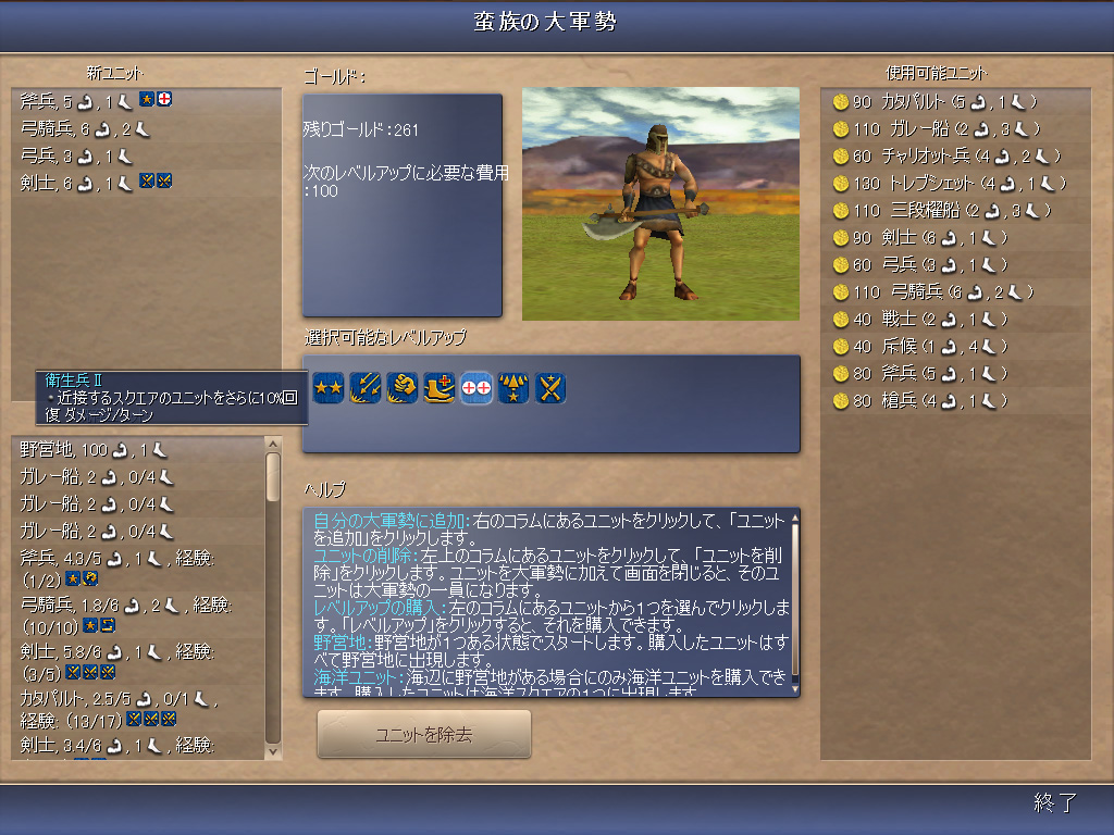 どの文明でも使えるユニットの追加は,今回はわずか2点。ガレー船に対して強い攻撃力を持つ「三段櫂船」と,都市ダメージに特化した攻城兵器「トレプシェット」,いずれもゲームの比較的前半に登場するものとなっている。CivIIIの拡張パックで,派手な対空兵器などが登場したのに比べると,少々寂しいところだ。今回は総じて,システム面の変更に力点が置かれた印象が強い。