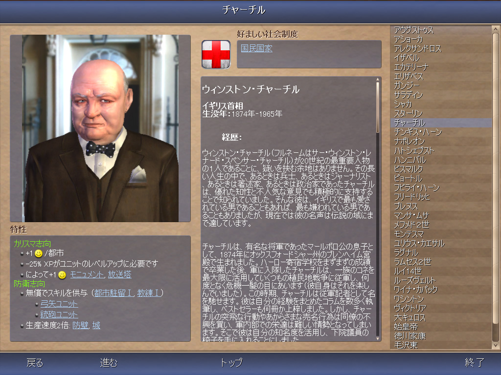 | ● | カリスマ志向:都市の幸福+1,ユニットのレベルアップの必要経験値が−25%など |