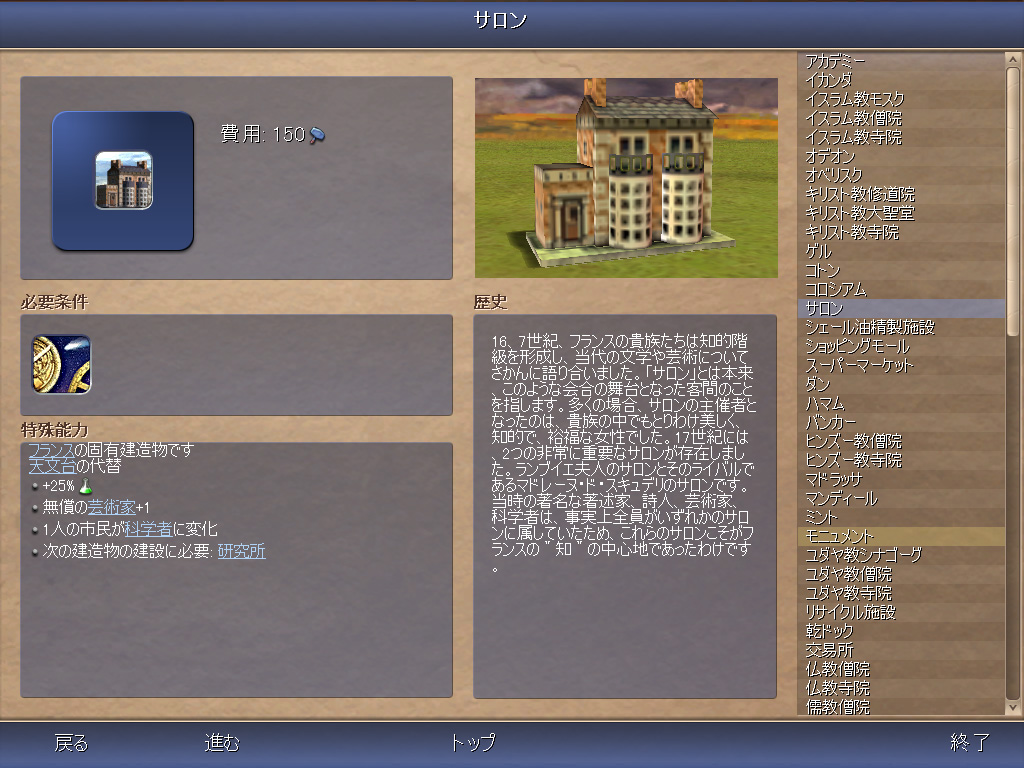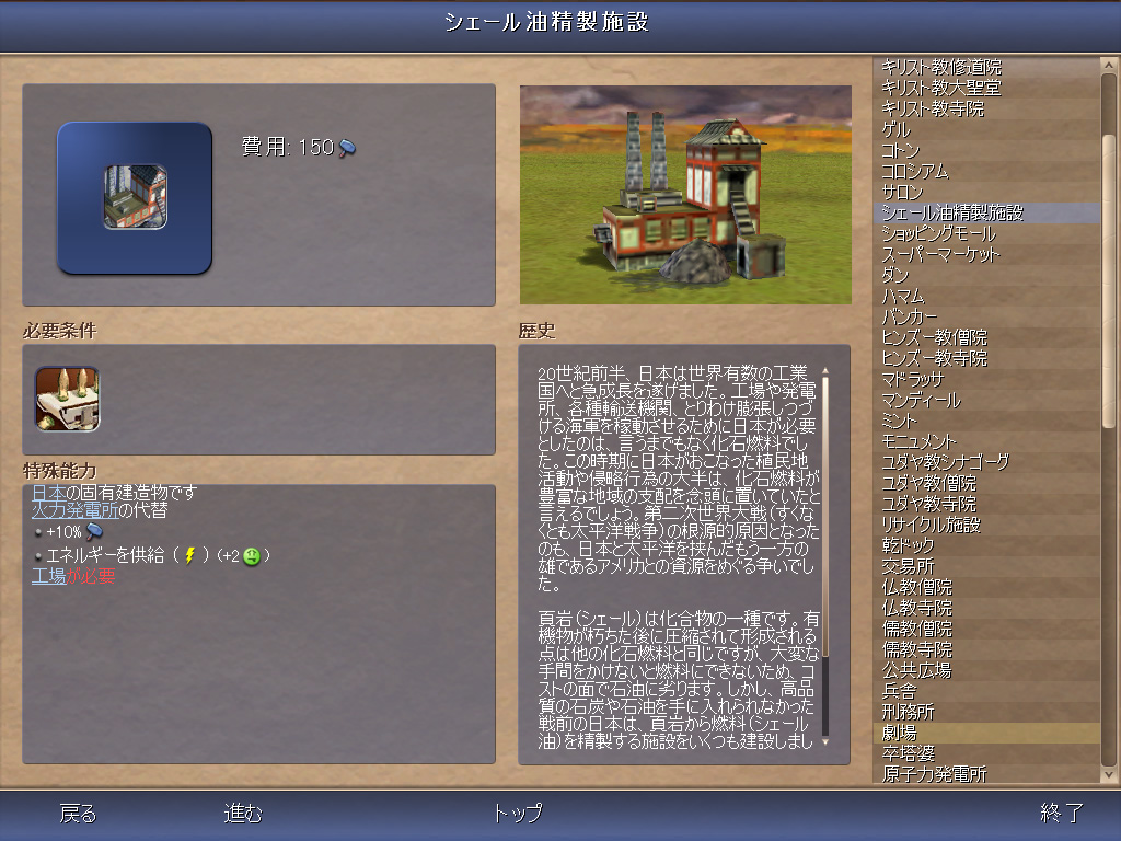 | 本文で紹介した,フランスの固有建造物「サロン」。芸術家が追加されるという機能は,いかにも,という感じ | こちらは日本の「シェール油生成施設」。火力発電所自体,重要性が低いうえ攻撃的な日本との相性も微妙 | 大型投石器「トレブシェット」は,カタパルトとカノン砲の間に登場する攻城兵器。ボーナスのため,都市攻めには有用 |