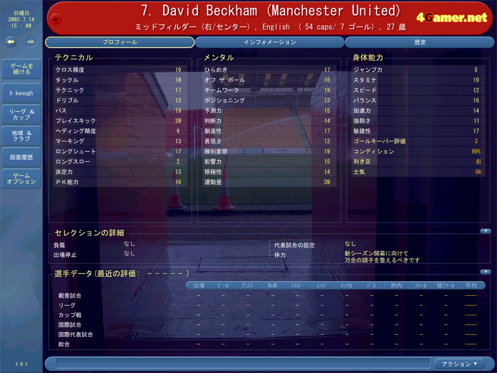 例えば,日本で一番有名な(?)外国人サッカー選手であるベッカムは,CM4のデフォルトのデータではレアルマドリードではなくマンチェスターユナイテッドに在籍している。また,前作でもそうであったが,(おそらく)権利の関係で日本のJ1,J2に関してのデータは架空のものとなっている。このあたりは若干の脳内補完が必要とされることになるわけだ。