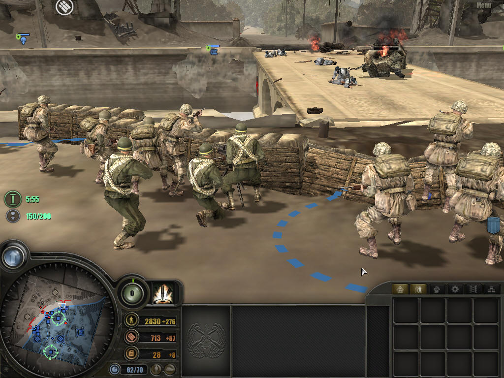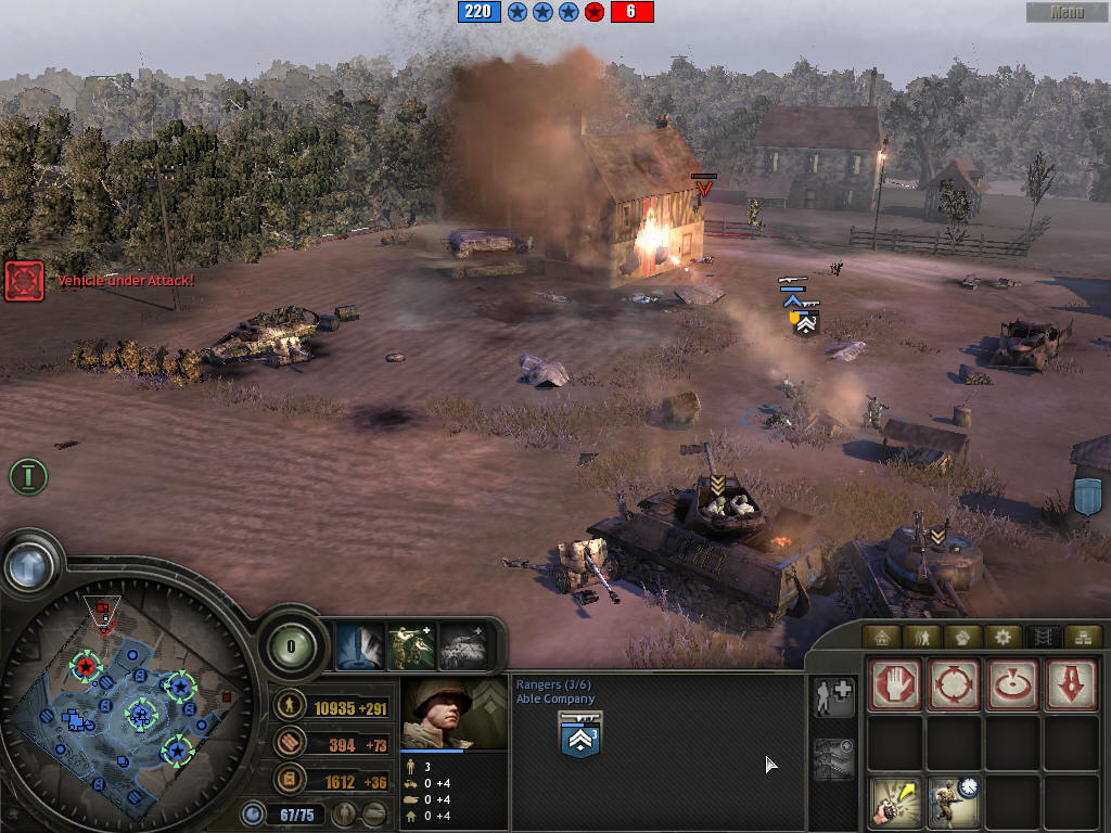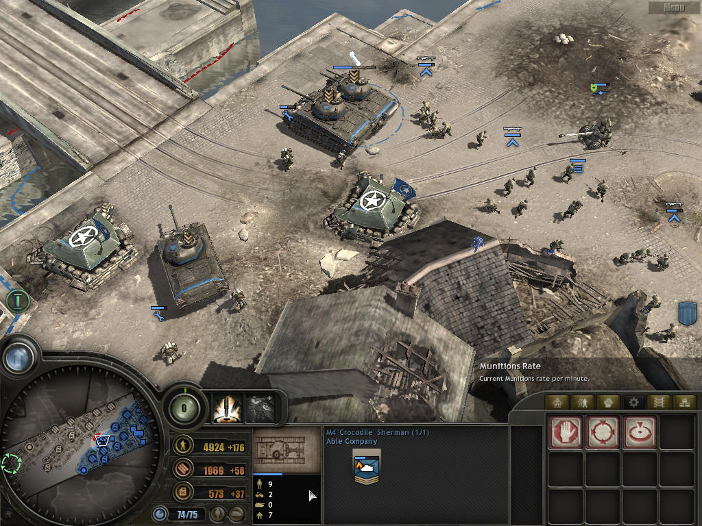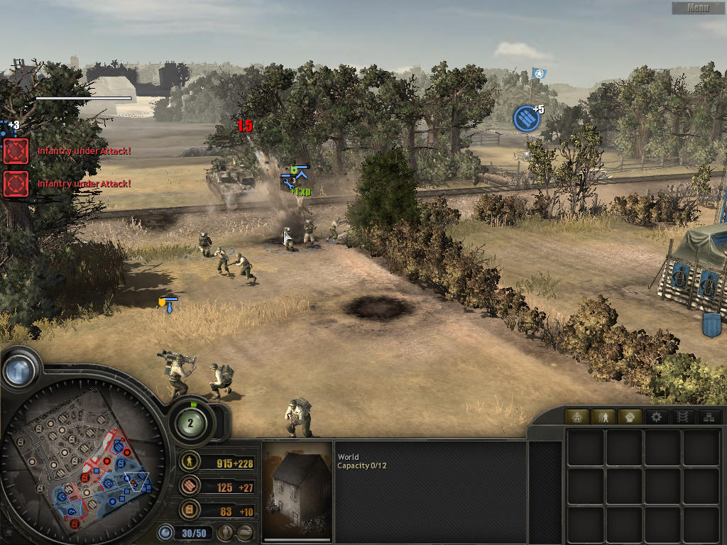 Company of Heroesでは,兵数の上限が厳しく設定されているため「ユニットを量産してラッシュを仕掛ける」というプレイスタイルは実行しづらい。プレイヤーは,もっぱら最大6名からなるスクワッド(分隊)を10個から20個ほど使って戦闘を進めることになる。