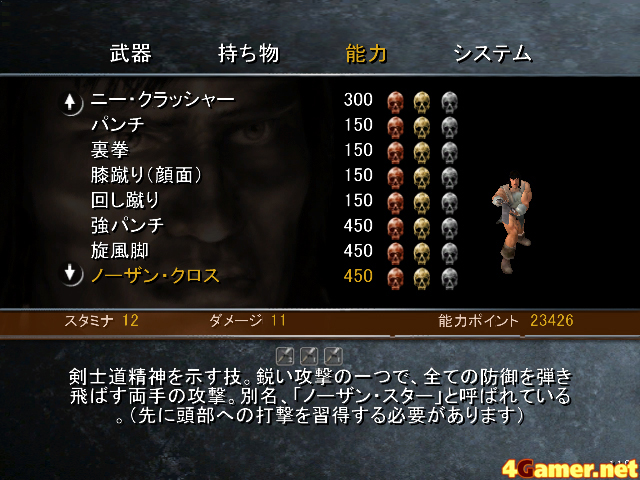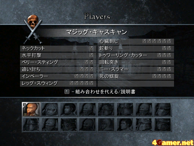 剣技は50種類以上も用意されており,同じ剣技にポイントをつぎ込めば,より強力なダメージを与えられるようになっている。また基本は剣や斧による攻撃だが,コンボによっては連続技の途中で蹴り/投げ/パンチ/追い討ちなども発動し,ゲーム中盤くらいともなると,「薙ぎ払い」→「膝蹴り」→「アッパー」→「投げ」→「倒れた相手に剣を突き立てる」といった多彩な攻撃も可能だ。