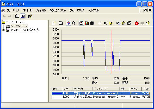 翻ってP5W DH Deluxe WiFi APではどうかというと,表2で示したBIOS 0701で,EISTは問題なく有効/無効の切り替えが可能だった。また,EISTを有効に設定してから「FINAL FANTASY XI for Windowsオフィシャルベンチマークソフト 3」を実行し,Windows XPの「パフォーマンスモニタ」で確認すると,266×8の2.13GHzという中間クロックで動作することがあるのを確認。もちろん断言はできないが,デスクトップ向けCore 2 Duoシリーズには,最高/最低クロックは別に,中間クロックが用意されていると見ていいのではなかろうか。