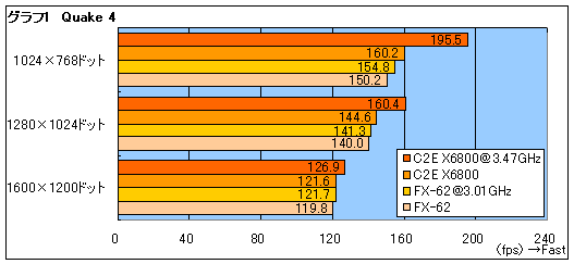 グラフ1は,「Quake 4」(Version 1.2)における平均フレームレートをまとめたものだ。一目見ると分かるとおり,Core 2 Extreme X6800では,オーバークロックによるパフォーマンスの上昇が,低解像度で顕著である。とくに,1024×768ドットでは,20%強という,圧倒的なまでの伸びを示しており,強烈な印象だ。3.01GHz動作でも,定格動作のCore 2 Extreme X6800を捉えられないAthlon 64 FX-62の差は明らかである。