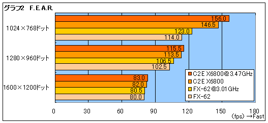 「F.E.A.R.」(Version 1.06)における平均フレームレートをまとめたのがグラフ2だ。