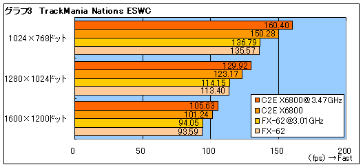 続いてグラフ3は,「TrackMania Nations ESWC」(以下TMN)のテスト結果をまとめたもの。Athlon 64 FX-62は,クロックの上がり幅が小さいためか,オーバークロックによるフレームレートの向上がわずかなのに対し,Core 2 Extreme X6800では,1024×768ドットで約10fpsと,オーバークロックの効果がしっかり結果として出ているのが分かる。