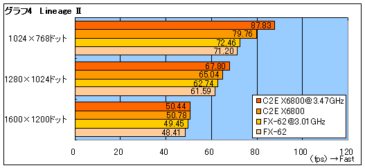 グラフ4は「Lineage II」のテスト結果だが,これも同じ傾向といっていいだろう。3.47GHzのCore 2 Extreme X6800は,1024×768ドットで87fpsと,強烈なまでに良好なスコアを叩き出している。ここでも,Core 2 Extreme X6800のオーバークロックには意味があることを裏づけるデータが出たというわけだ。