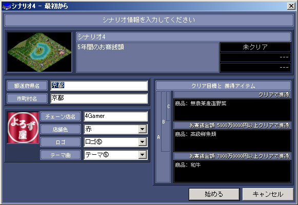 先に前作からの変更点についてまとめておきたい。まず,ザ・コンビニIIIで導入された,ランキング機能などのインターネット対応はなくなった。一つ一つのマップがすべてシナリオ選択形式になったのに加え,シナリオをクリアしないと次のシナリオが出現しない「コンクエスト方式」の進行が採用された。序盤は漠然とプレイしていてもクリアできる難度だが,プレイが進むにつれてクリア条件が厳しくなっていくので,初心者からシリーズを遊び尽くしている上級者まで楽しめる仕組みとなっている。