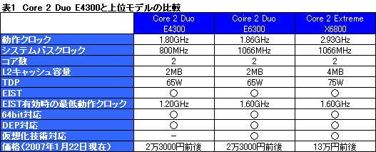 2007年1月21日,Intelはデスクトップ向けCore 2 Duoシリーズの最下位モデルとなる「Core 2 Duo E4300/1.80GHz」を発売した。従来のCore 2 Duo E6000番台から差別化された,E4000番台のプロセッサナンバーからも想像できるように,スペック面でいくつか明確な制限が設けられるローエンド向けモデルとなる。