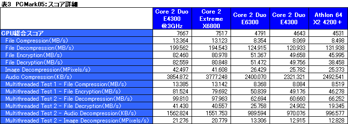 ここでは,純粋に動作クロックが高いCore 2 Duo E4300@3GHzと,メモリコントローラを内蔵するAthlon 64 X2 4200+の優位性を確認できる。