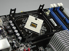 さてこのi975Xa-YDG,Intel 975P Expressを採用するため,ノートPC用チップセットがサポートする省電力機能「拡張版Intel SpeedStepテクノロジ」は利用できない一方,2本のPCI Express x16スロットを搭載し,ATI Technologies独自のデュアルグラフィックスカードソリューションであるCrossFireをサポート。CPUクーラーを取り付けるための,いわゆるリテンションキットは,Socket478版Pentium 4対応マザーボードと同じものが用意されている。