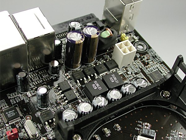 | Socket479と電源周りのアップ。CPUソケット周りはこれで決定だろうが,搭載するコンデンサのスペックなど,電源周りは最終製品で変わる可能性がある |