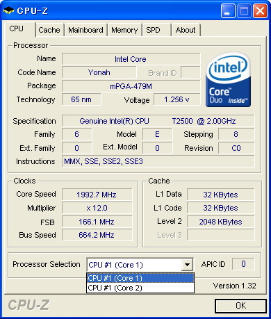 というわけで,ここからはテストに入っていきたい。今回用意したのは,Core Duo T2500/2GHzとCore Duo T2300/1.66GHz。そこで「CrystalCPUID」の「Intel Enhanced SpeedStep Control」を用いてCore Duo T2500の倍率設定を12から11に変更し,Core Duo T2400/1.83GHz相当でのテストも行うことにした。また,1コア動作時の性能を見るため,Core Duo T2500&T2300では,Windows XPのBoot.iniファイルに「/ONECPU」というオプションを追加して1コア動作させ,そのときのスコアもチェックしている。グラフ中「1Core」という表記がそれに当たるので,参考にしてほしい。