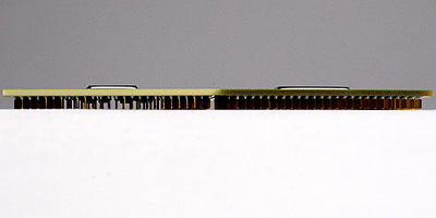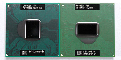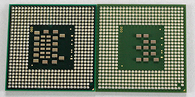 | Core Duo T2500/2GHz(どの写真でも左)とPentium M 760/2GHz(どの写真でも右)を比較してみた。一番したの写真は真横から見たもの。基本的にはよく似ており,478ピン構成である点も変わらないが,ピンアサイン(配置)は異なっており,CPUソケットの互換性はない。ダイの高さは目視する限り同じで,銅板を使う場合,同じ厚さのものが利用できそうだ |