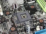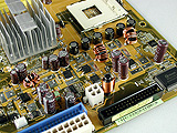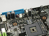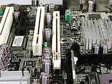 | PCI Express x16スロット周辺。スロットの左にある背の高いコンデンサと,写真手前の金具に注目してほしい |