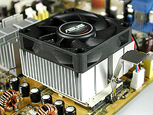 | 945GT Speedster Plusのパッケージ付属するCPUクーラーはスリムタイプで,ファンの回転数もかなり高め。リテンション金具の問題ともども,リテンションを取り外して,別途Socket478用クーラーを用意する方向で対処したい |