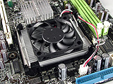 | CPUクーラーを固定するには,マザーボード上に用意されている金具に,付属CPUクーラーのクリップで引っかけるほかない。ファンの交換による静音化/高効率化は図れるが,ヒートシンクまで交換するのはかなり難しいだろう |