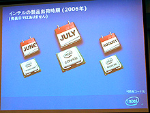 | Intelが2006年6月2日に示した,Conroe(Core 2 Duo)を,7月中に出荷開始するというスライド。7月中に出荷する以上は,どんなに遅くとも8月には発売されるはずだ。ちなみに,6月出荷開始予定とされているWoodcrest(ウッドクレスト)とは,Coreマイクロアーキテクチャに基づいたワークステーション/サーバー向け新CPUの開発コードネーム |