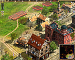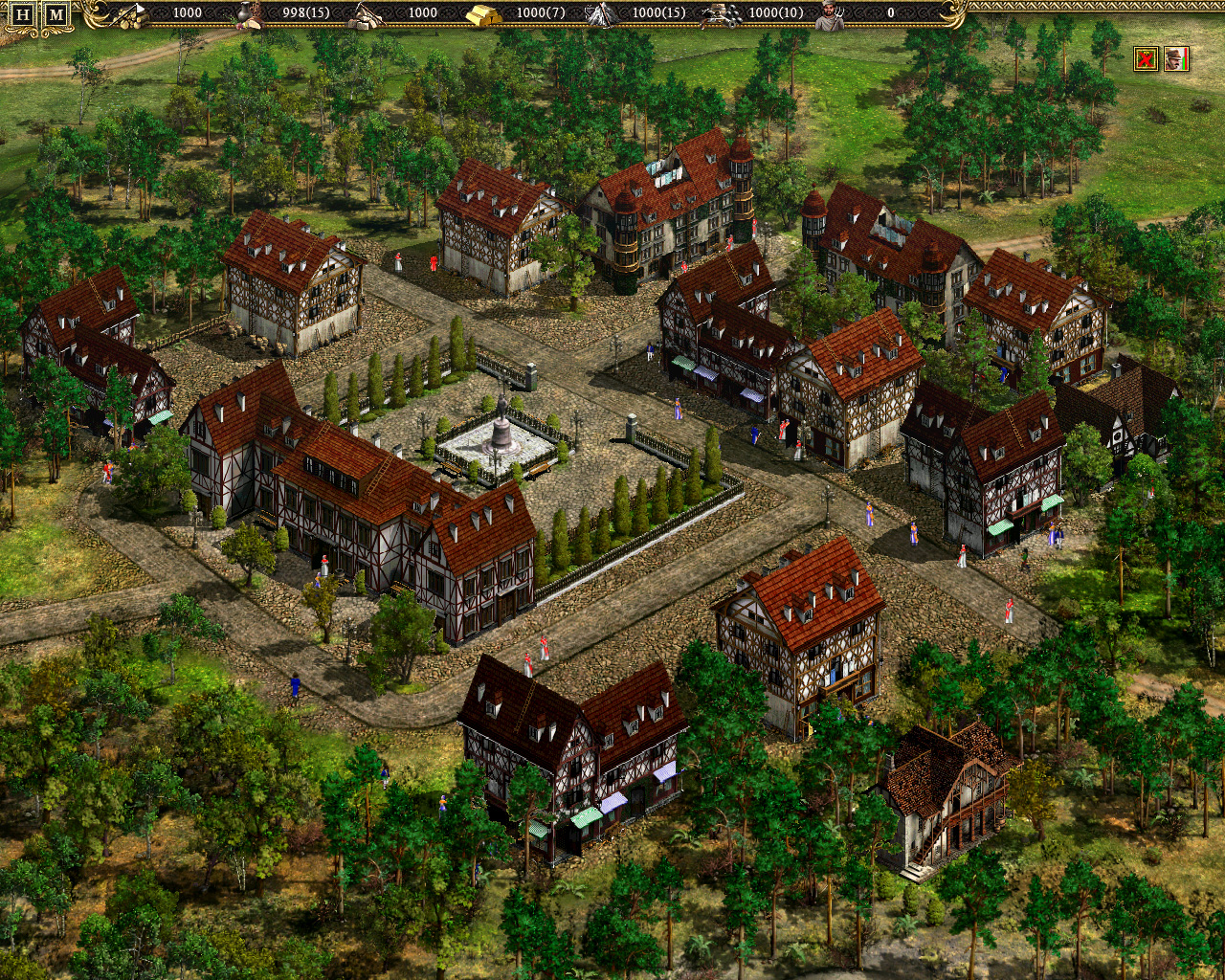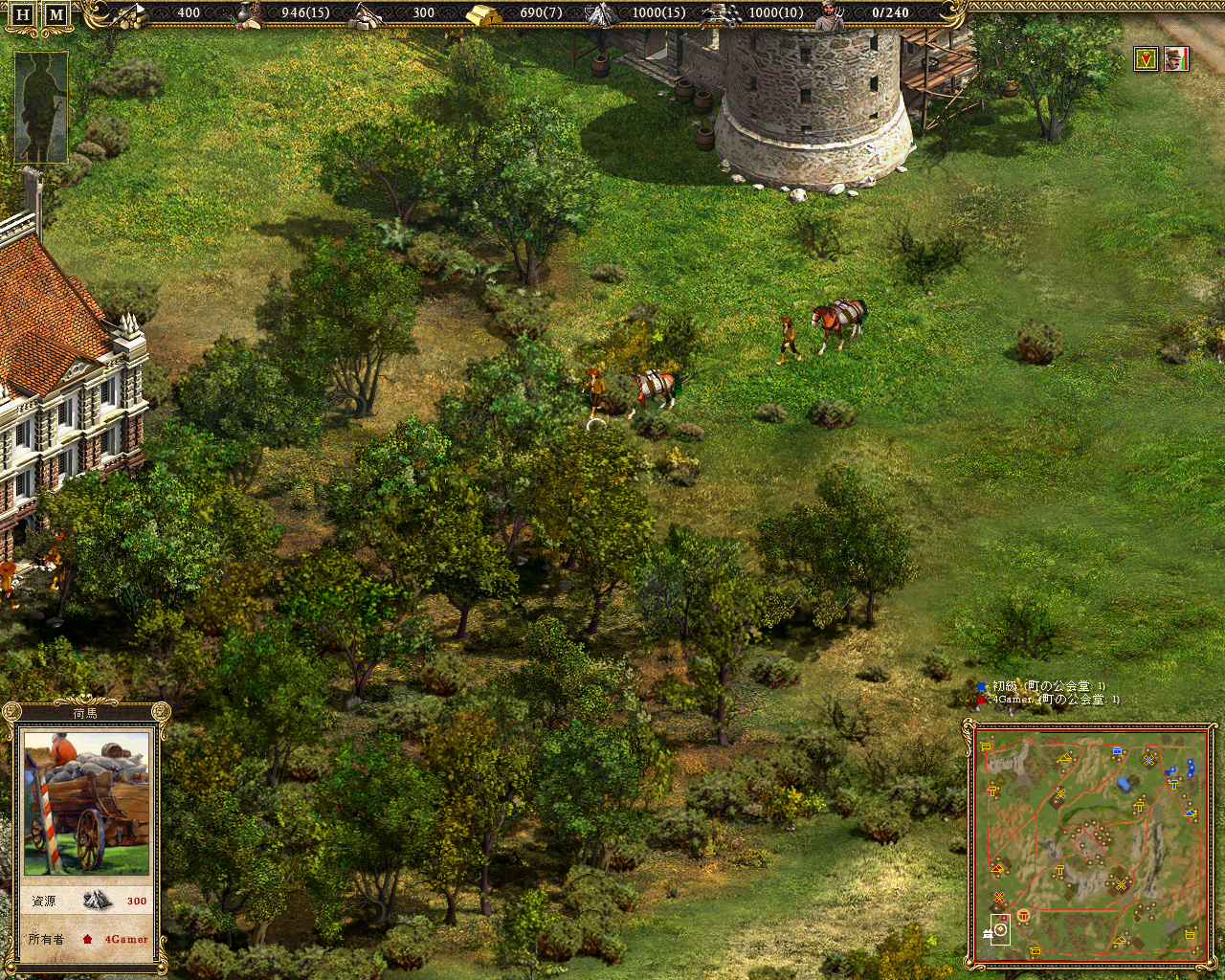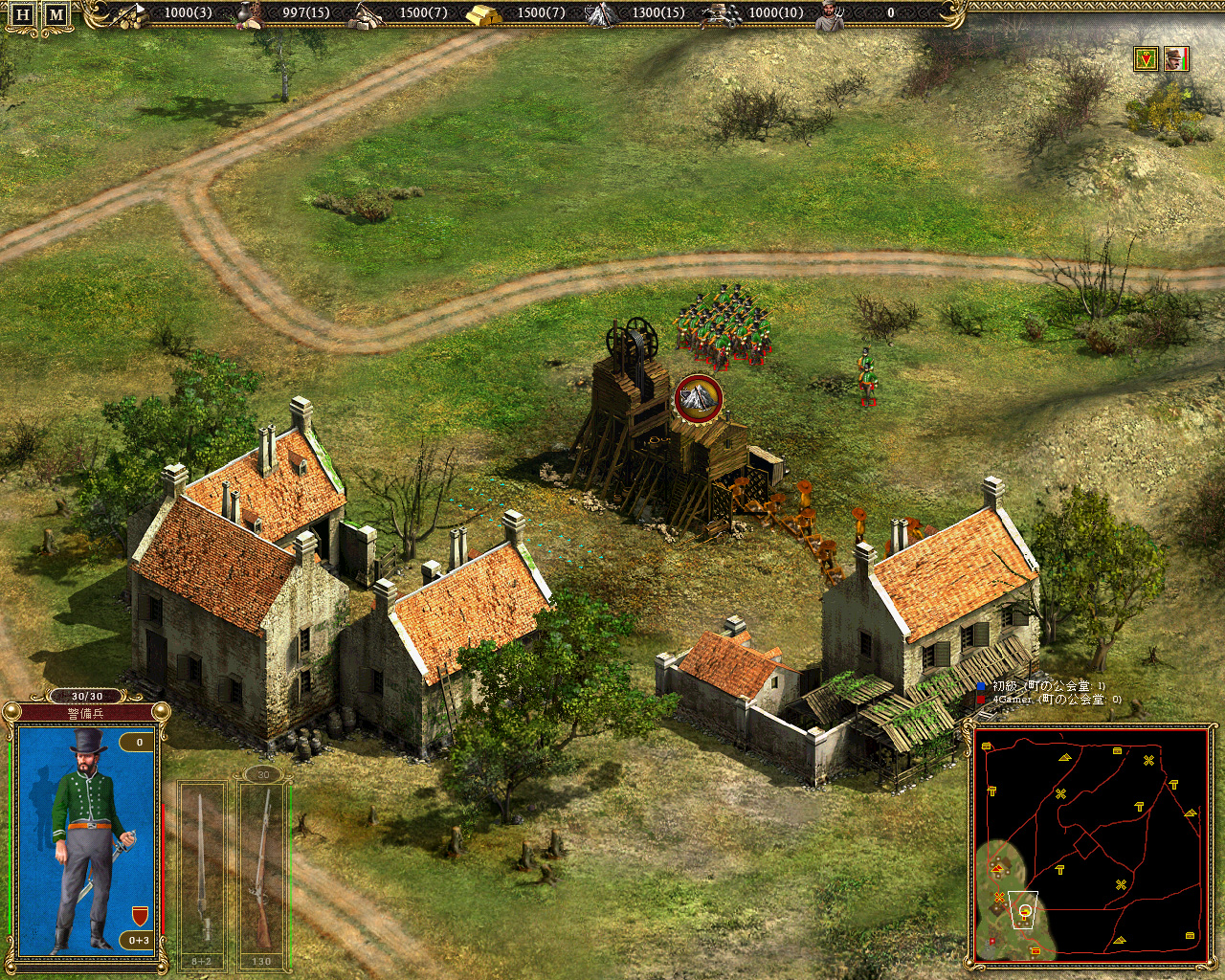 本作の内政における新機軸は,資源採集が自動化されたことにある。資源の種類は従来どおり,木,食料,石,金,鉄,石炭の6種類。このうち木と石は町の住民に集めさせる形だが,それ以外の食料・金・鉄・石炭に関しては,マップ上に点在する「村」を占領することで手に入れる。生産施設を備えた村の住民が資源を生産し,その資源を積んだ荷駄が町の公会堂へと到着することで,資源が増えていく。つまりプレイヤーは,施設のある村を占領/維持し,村の規模を順次アップグレードしていくだけでよいのだ。