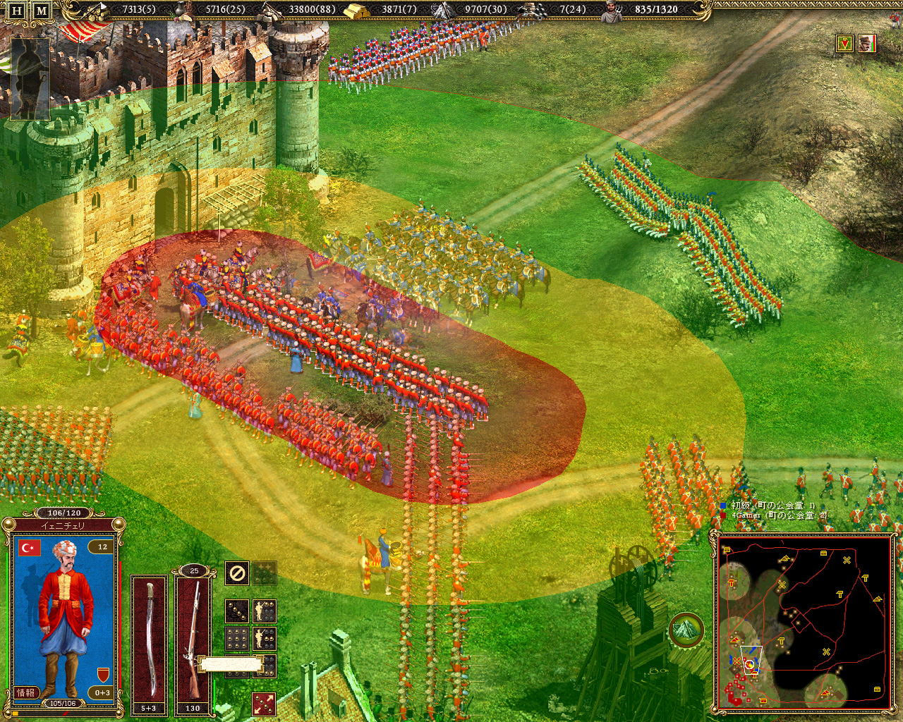 | 銃撃の効力範囲を示す表示が用意されている。赤のゾーンで撃てば必殺だし,緑のゾーンだと効果は薄い | 横隊陣形の場合は,前列・中列・後列で3段撃ちができる。だが基本的には一斉に撃ったほうがよいようだ | 陣形の上にある赤と黄色のバーが士気の高さを示す。黄色の部分がゼロになると陣形は壊滅する |