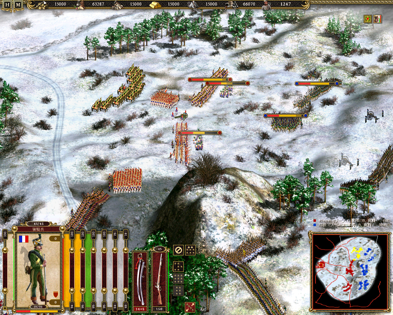| 通常のプレイではさすがに6万4000ユニットは登場しないが,それでも優に1万は超える | ナポレオン時代の戦術をフィーチャーし,陣形を組んだ部隊同士の攻防を精緻に描いている | 歩兵・騎兵・砲兵をうまく組み合わせるのがカギ。どれか一つでもおろそかにすると勝利はおぼつかない |