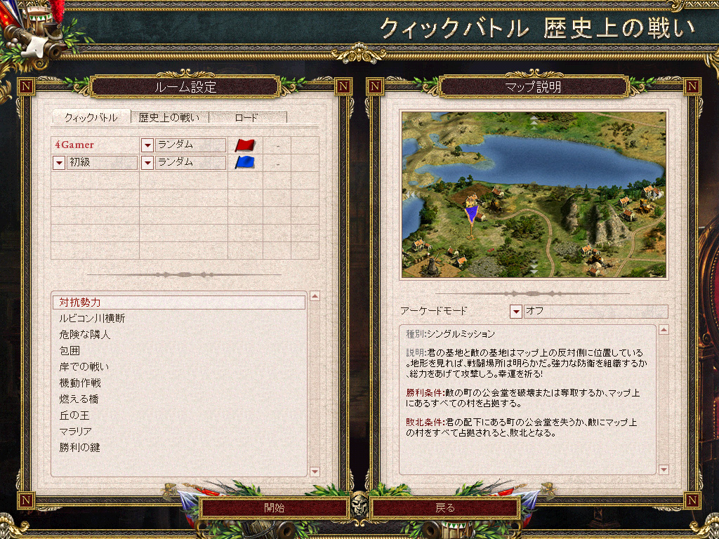 「クイックバトル」はいわゆるスカーミッシュモードで,国とマップを選んでAIと対戦する。「歴史上の戦い」はアウステルリッツ,ヴァグラムなど史実の会戦を再現したモードである。