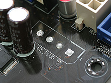 PCI Express x16接続のグラフィックスカードに別系統から電力を供給し,動作の安定を図る「EZ Plug」コネクタは,なぜかA8R32-MVP Deluxeで省略された。A8R-MVPでは搭載されていただけに,少々疑問が残る |