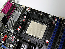 気になるスロット構成は,(当然ながら)デュアル16レーンで動作するPCI Express x16 ×2と,PCI Express x1 ×1,PCI×3。注目すべきは,ASUSTeK Computer製のRadeon Xpress 200 CFEマザーボード「A8R-MVP」や,他社製の同チップセット搭載製品とは異なり,両PCI Express x16間が2スロット分空いている点だ。