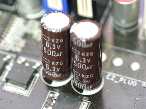| 電源周りには,富士通メディアデバイス製の機能性高分子コンデンサなど,一定水準を満たした国産コンデンサを配しており,3フェーズながら信頼性は高いと見ていいだろう。もちろん,それ以外の部分にも,日本ケミコンのKZGシリーズなどが置かれており,抜かりはない |