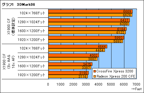 なお,今回は製品名が長いものが多いため,グラフ内の表記は適宜略している。「Radeon」の表記を省略し,さらにCrossFire動作は「CF」という文字列で示したので注意してほしい。「X1900 CF」は「Radeon X1900のCrossFire動作」ということだ。逆に「X1900 XT」は,Radeon X1900 XTと動作クロックが同じであるRadeon X1900 CrossFire Edition搭載カードを「Radeon X1900 XTカード」としてシングルカード動作させたことを示している。マザーボードは,それぞれ搭載するチップセットで表記する。