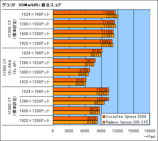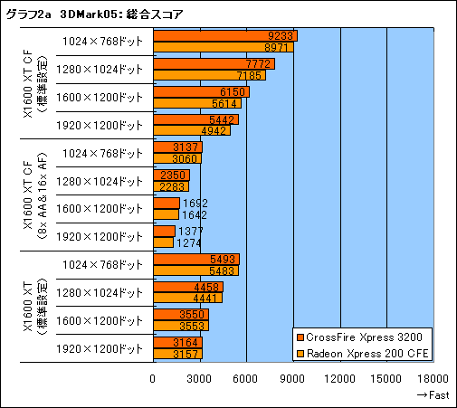 というわけで,グラフ2,2aで3DMark05の総合スコアを見てみよう。グラフは数字のみで示しているのがRadeon X1900 CrossFire,「a」の文字付きはRadeon X1600 XT CrossFire動作のものである。