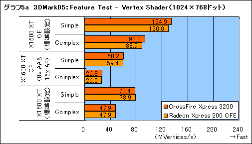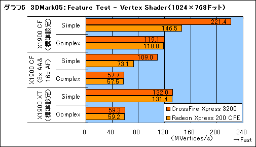 続けてFeature Testだが,ここで注目したいのはVertex Shaderテストだ(グラフ5,5a)。とくにRadeon X1900のCrossFireでは,項目「Simple」において,非常に大きなスコアの向上が見て取れる。念のため,ディスプレイ解像度を変更してテストを行っても傾向は変わらなかったので,3DMark05のVertex Shaderテストでは,PCI Express x16の帯域を使い切るほどの莫大なデータが流れていると見ていいだろう。