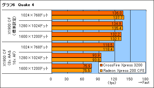そして今回も,それは変わらず。なかなか理解に苦しむスコアだ。Radeon Xpress 200 CFEで見られる,標準設定時の落ち込みがCrossFire Xpress 3200ではなくなったため,ついに最適化を果たしたように見える。その一方,8x AA&16x AF設定時のスコアは1280×1024ドットと1600×1200ドットでほとんど変わらないなど,やはりまだ,全幅の信頼はできそうにない。