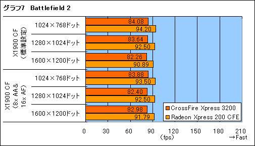 Battlefield 2は,Quake 4よりもさらにCPUがボトルネックとなりやすいタイトルであるため,解像度や描画負荷の差では,スコアの差はほとんど出ない(グラフ7)。ただ,CrossFire Xpress 3200のスコアが,全体として明らかに低い点は見逃せないところ。BIOSかドライバのチューニング不足を指摘できよう。