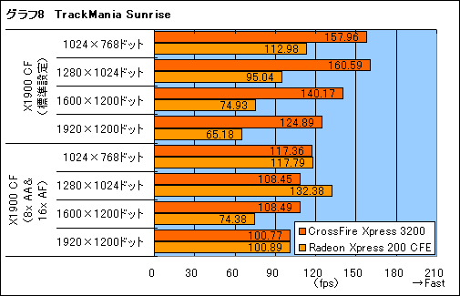 最後に「TrackMania Sunrise」のスコアを見てみることにする。TrackMania Sunriseにおいては,1周53秒程度の「Paradise Island」というマップのリプレイを3回連続で実行し,その平均フレームレートをBattlefield 2と同様,Fraps 2.60で測定した。