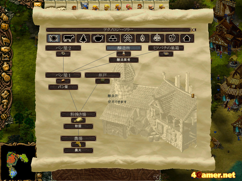 ここに建物と建材加工の要素が加わることで,ゲームはさらに複雑になっている。粉屋が働く"粉挽き場"は割と簡単に作れるが,パン屋が働く"パン屋"を建てるには"レンガ"