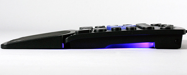 | 側面から。高さは一番あるところでも24mm。なお,底面部に青色LEDが埋め込まれており,写真右端にある小さなボタンで,点灯/消灯を切り替えられる。もっとも,このLEDは本当に単なる飾りで,青く光る以外に意味はない |