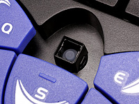 キーの形状は使用頻度や配置によってかなり大きな変化が付けられている。中でも目立つのは中央の青色キー群だ。FPSで最も基本的なキーと言える移動用の[W/S/A/D]と,武器の切り替えなどによく利用される[Q/E]が,大きな面積を占めて中央に鎮座している。数字キーを利用した武器のショートカット選択時に誤って押す危険性があることで,[Q]と[E]を使わないFPSプレイヤーは少なくないが,Cyber Snipaでは,数字キーと離れているうえ,キー自体も大きくなっているから,押し間違える危険はかなり減っているといっていい。