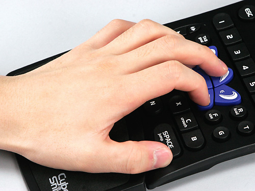 親指で操作することになる[C]や[スペース]は,本体右手前に割り当てられている。シングルプレイ重視型のFPSでは,一般に[C]キーが対応するしゃがみ動作が重要になるが,“親指のホームポジション”次第では,左右の[X]や[B]にしゃがみ動作を割り当てるのも手だ。