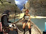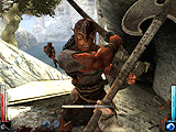 | レアンナと共に,廃墟となった寺院のある孤島へと向かう。このエピソードでは,彼女はプレイヤーの体力を回復してくれる頼もしい味方だ | アメリカでは,本作は18歳以上の“Mレーティング”に指定されており,卑語やセックス描写こそないが,体の各所が切り刻まれるゴア表現あり | 右上の木箱を吊り下げたクレーンを動かすことで,焚火で暖をとっていたブラックナイトたちを突き飛ばす。物理エンジンを使ったパズルの一例だ |
