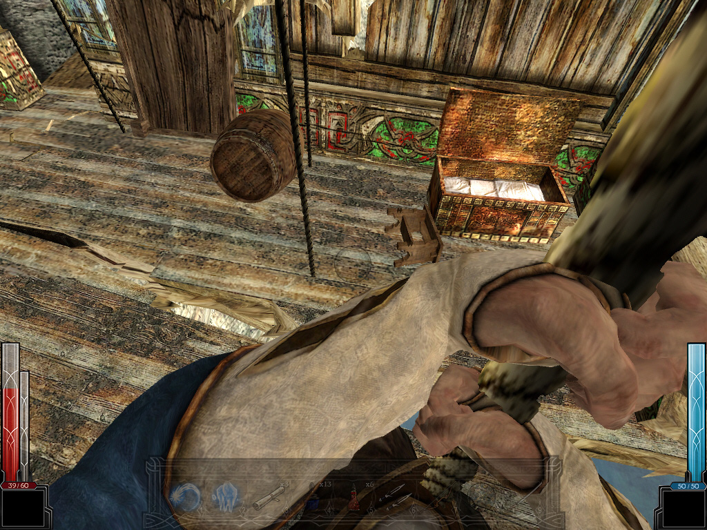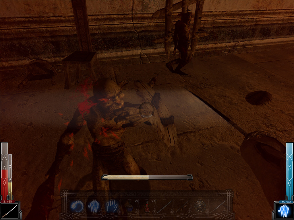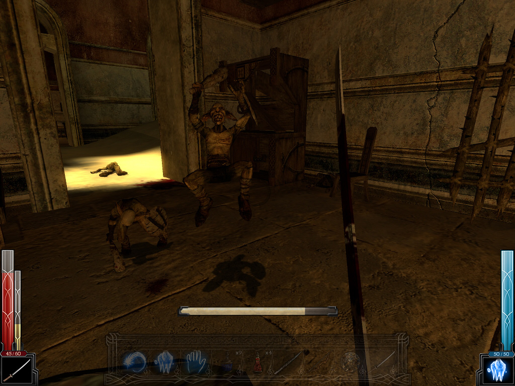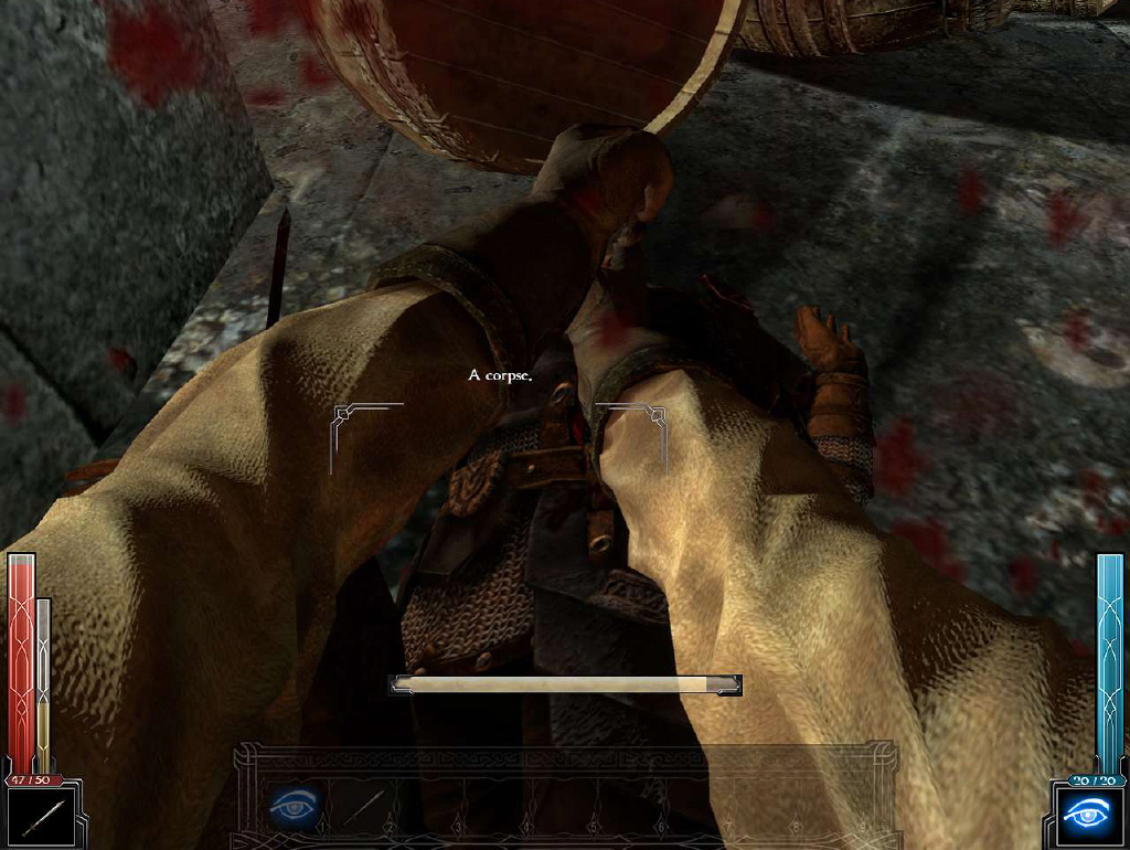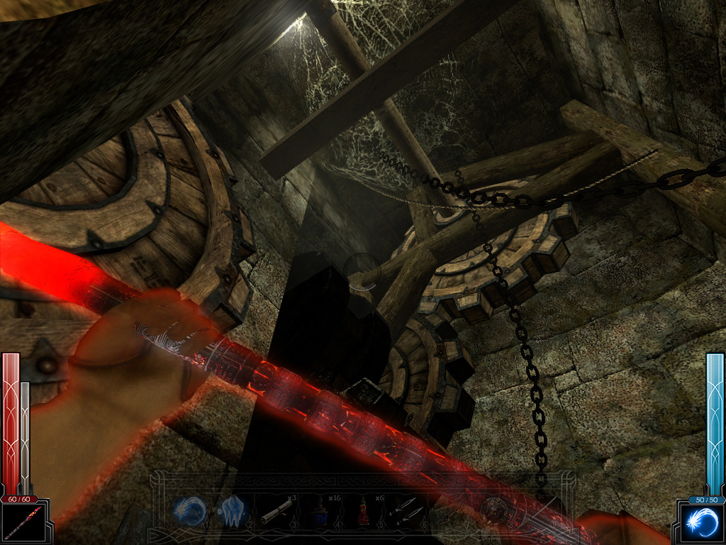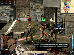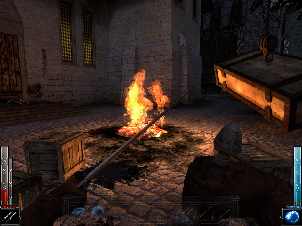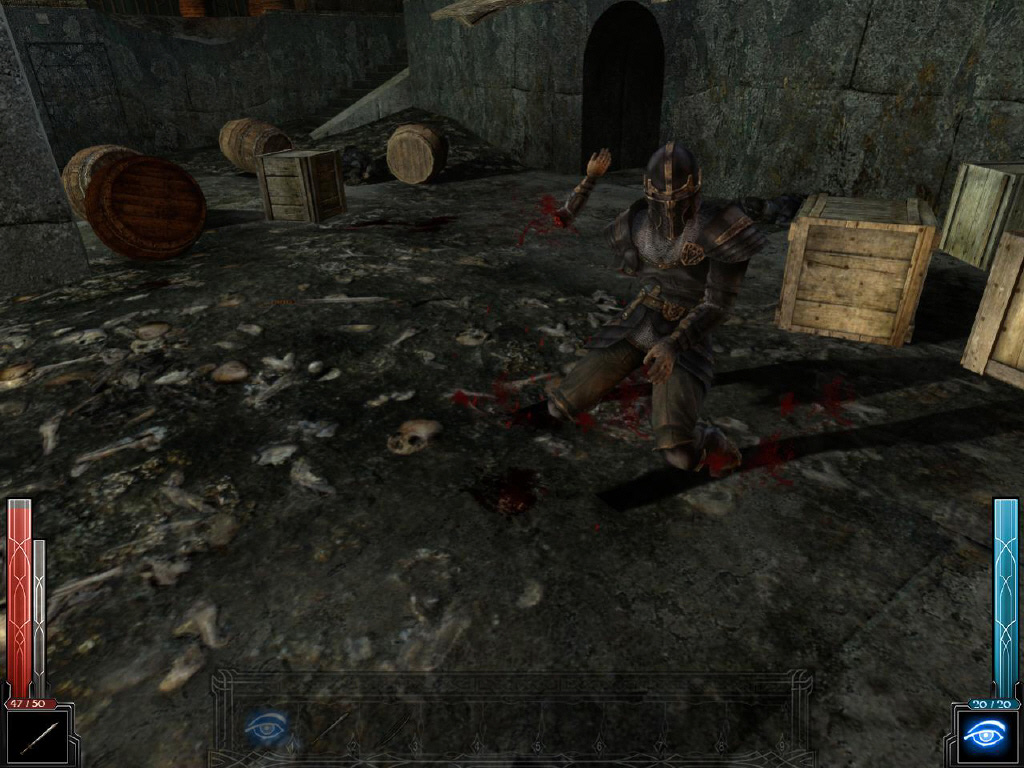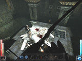 | Dark Messiahには赤いヘルスバーの隣に黄色いアドレナリンバーが存在し,戦闘によって満タンになると,攻撃力や集中力が一定時間アップする。テレキネシス魔法では,人体のような重いものでも持ち上げられる。「Half-Life 2」のグラビティガンを連想させる面白い効果だが,ゲーム中で何度もお目にかかれる技ではない |