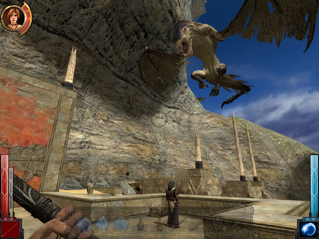 | Dark Messiahでは,屋外マップはあまり多くない。画像の巨大モンスターは,パオ=カイと呼ばれるドラゴンで,キャンペーン中に何度かプレイヤーと対決することになる。ただし,剣や魔法といった通常攻撃で倒すことはできないようだ |